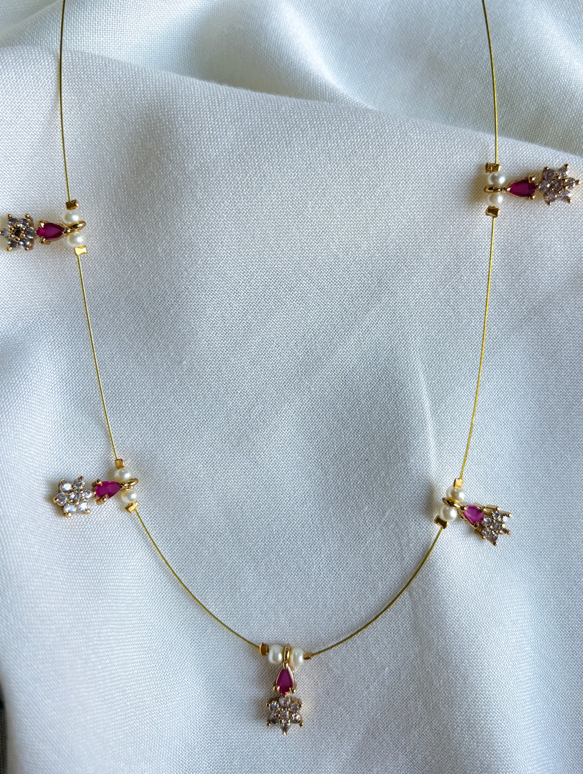 The Anvika Necklace by NAQSH blends delicate charm with timeless tradition. Adorned with ruby-red teardrop stones paired with sparkling zircon floral motifs and dainty pearl accents, this necklace captures the essence of festive elegance.