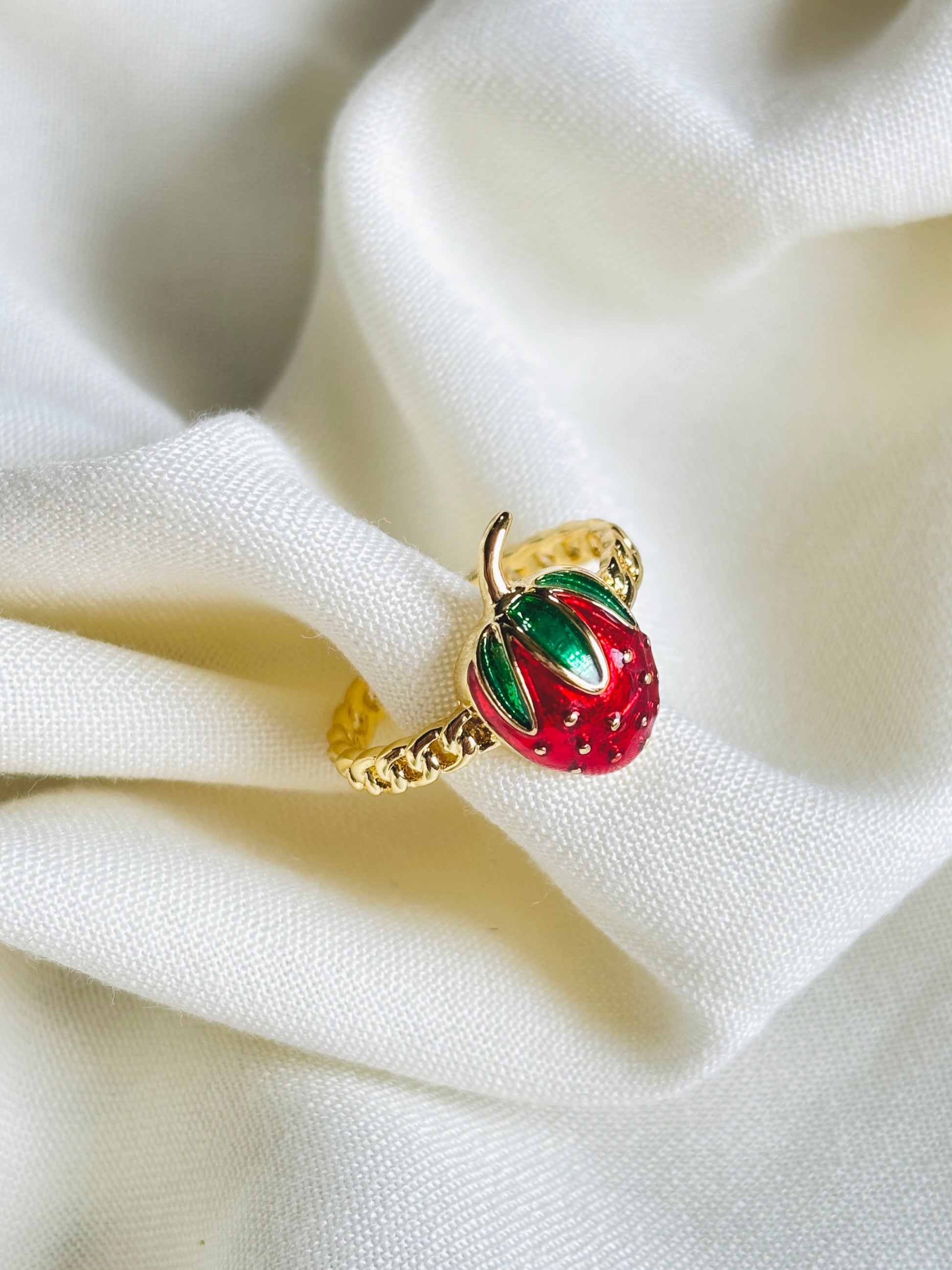 Bursting with charm, the Berrycute ring features a glossy red strawberry charm atop a gold-toned band with a playful twist design. It's the perfect accessory for those who love sweet details with a splash of personality. Wear it solo or stack it for a juicy pop of fun!