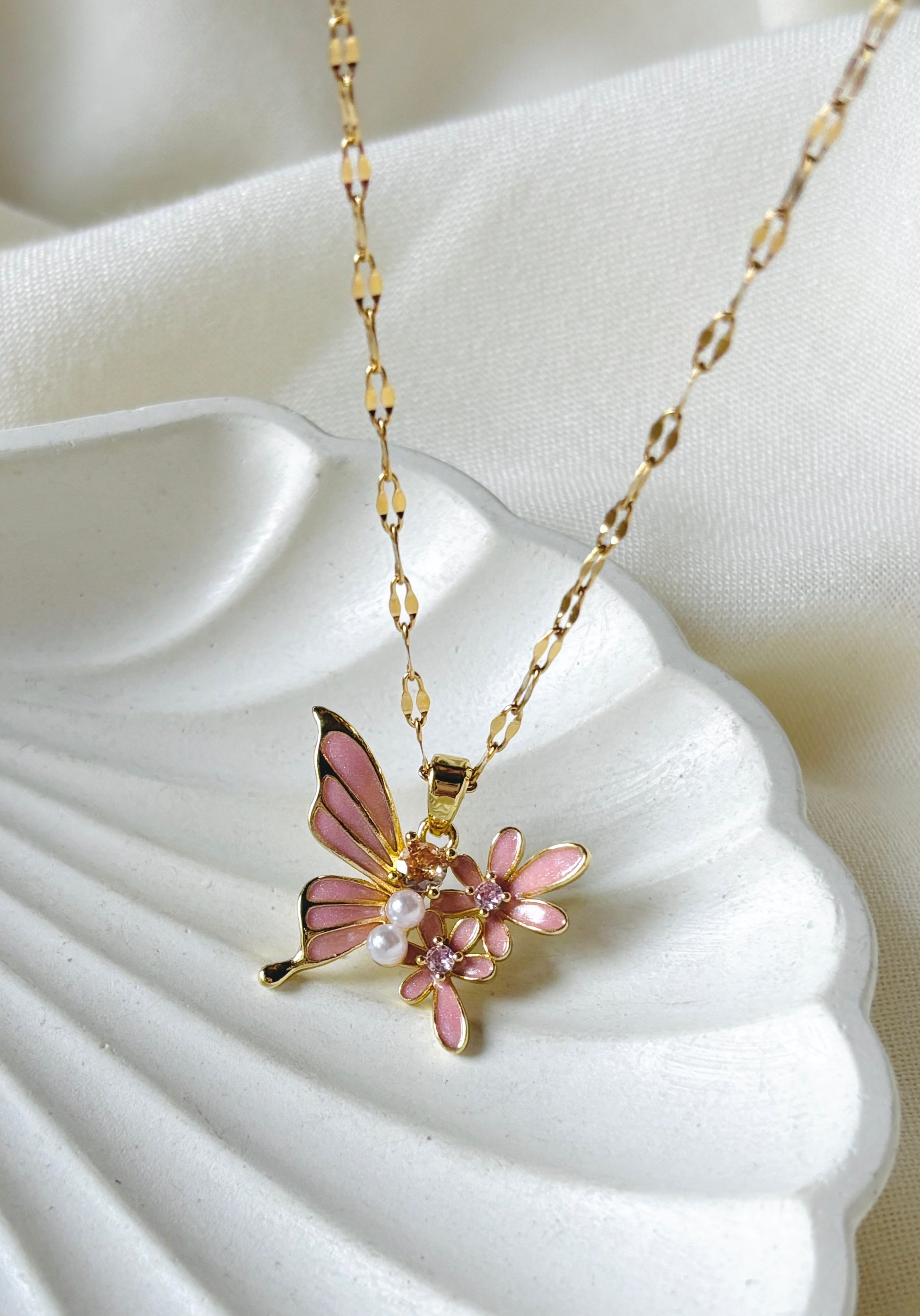 Delicate, dreamy, and full of charm — Flutterelle is a whimsical gold-plated necklace featuring a butterfly mid-bloom with pink enamel wings, pearl accents, and dainty floral details. Designed to capture the magic of spring, this piece adds a romantic and feminine touch to any look.