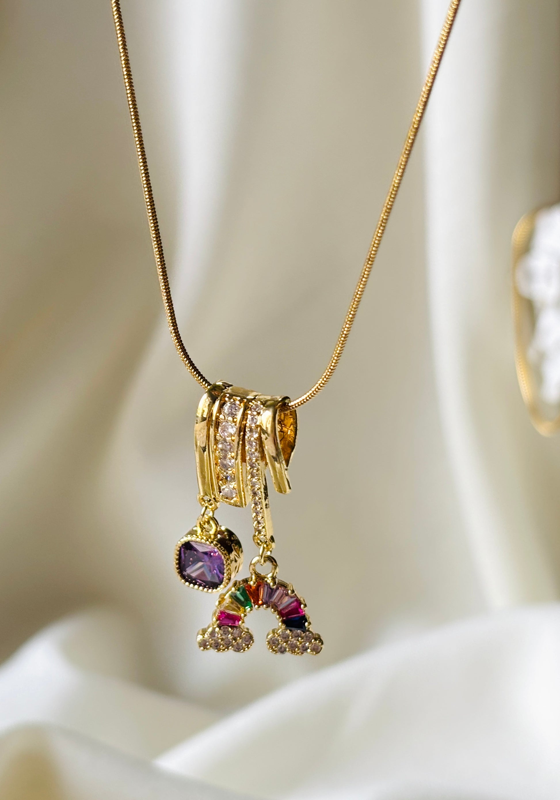 Say hello to Glimmera, a radiant necklace that brings joy, color, and sparkle to your every day. Featuring a multi-gem rainbow charm, a faceted violet stone, and shimmering rhinestone-draped loops — all suspended from a sleek gold snake chain — this necklace is a celebration of color and light.