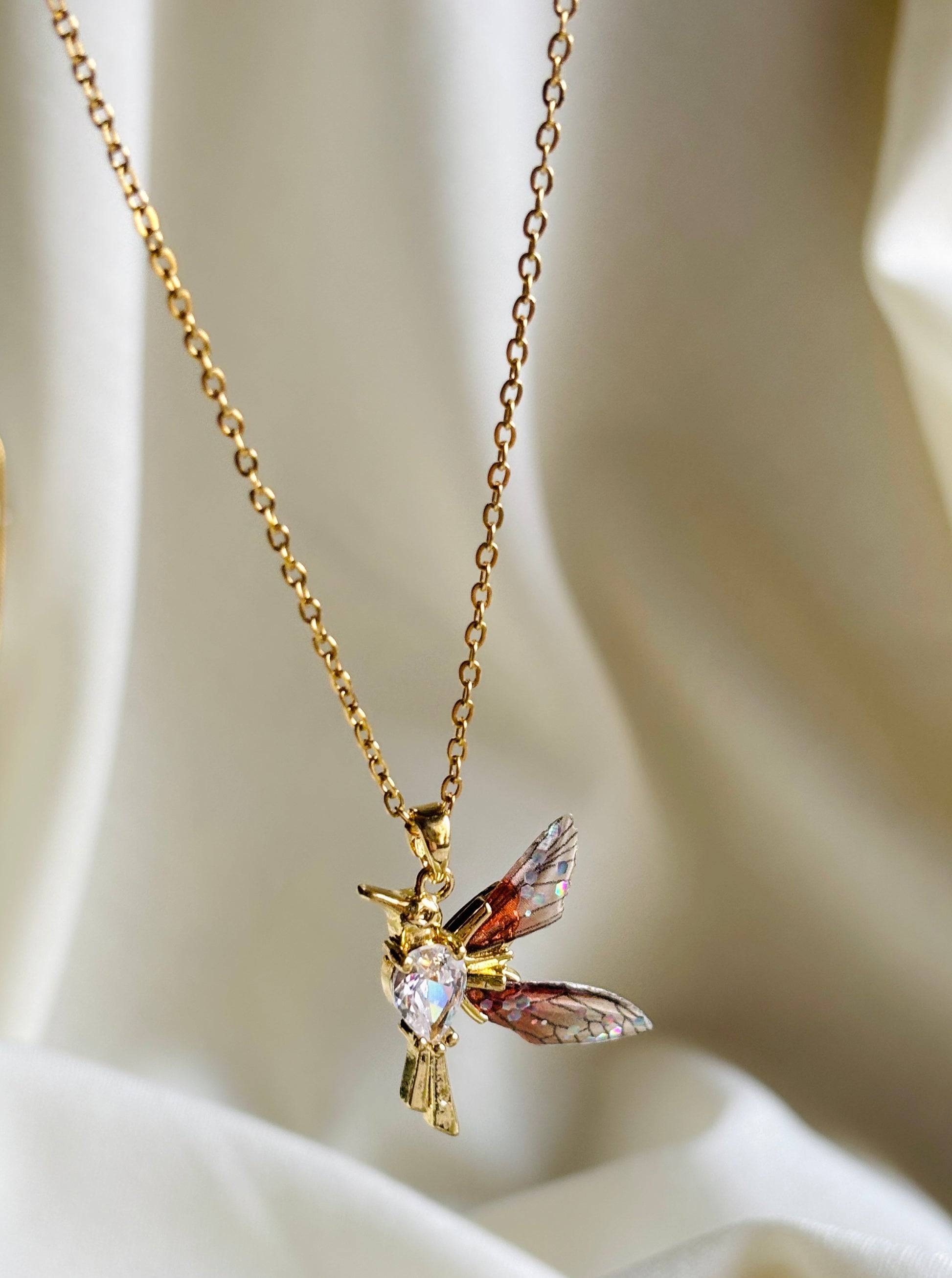 Delicate, radiant, and full of charm — Rosafly is a graceful hummingbird pendant that captures the soft beauty of flight. With shimmering pink-toned wings and a heart-shaped crystal at its center, this gold-plated necklace is designed to uplift your everyday look with a touch of magic and femininity. A symbol of joy and resilience, it's perfect as a heartfelt gift or a personal keepsake.