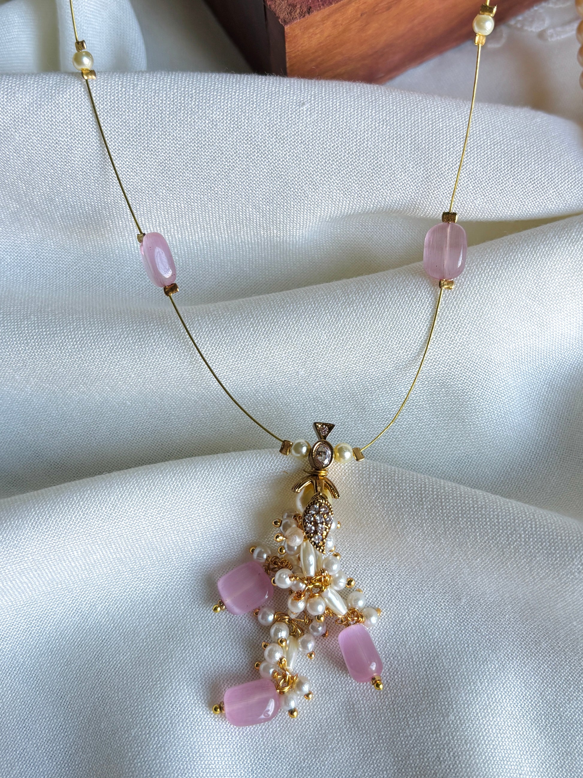 The Ruhani Necklace by NAQSH is a poetic fusion of tradition and grace. Featuring a cascade of luminous pearls intertwined with soft blush-pink stones, the pendant flows gracefully from a sparkling golden motif. The delicate chain is accented with pink beads, adding to its romantic charm.