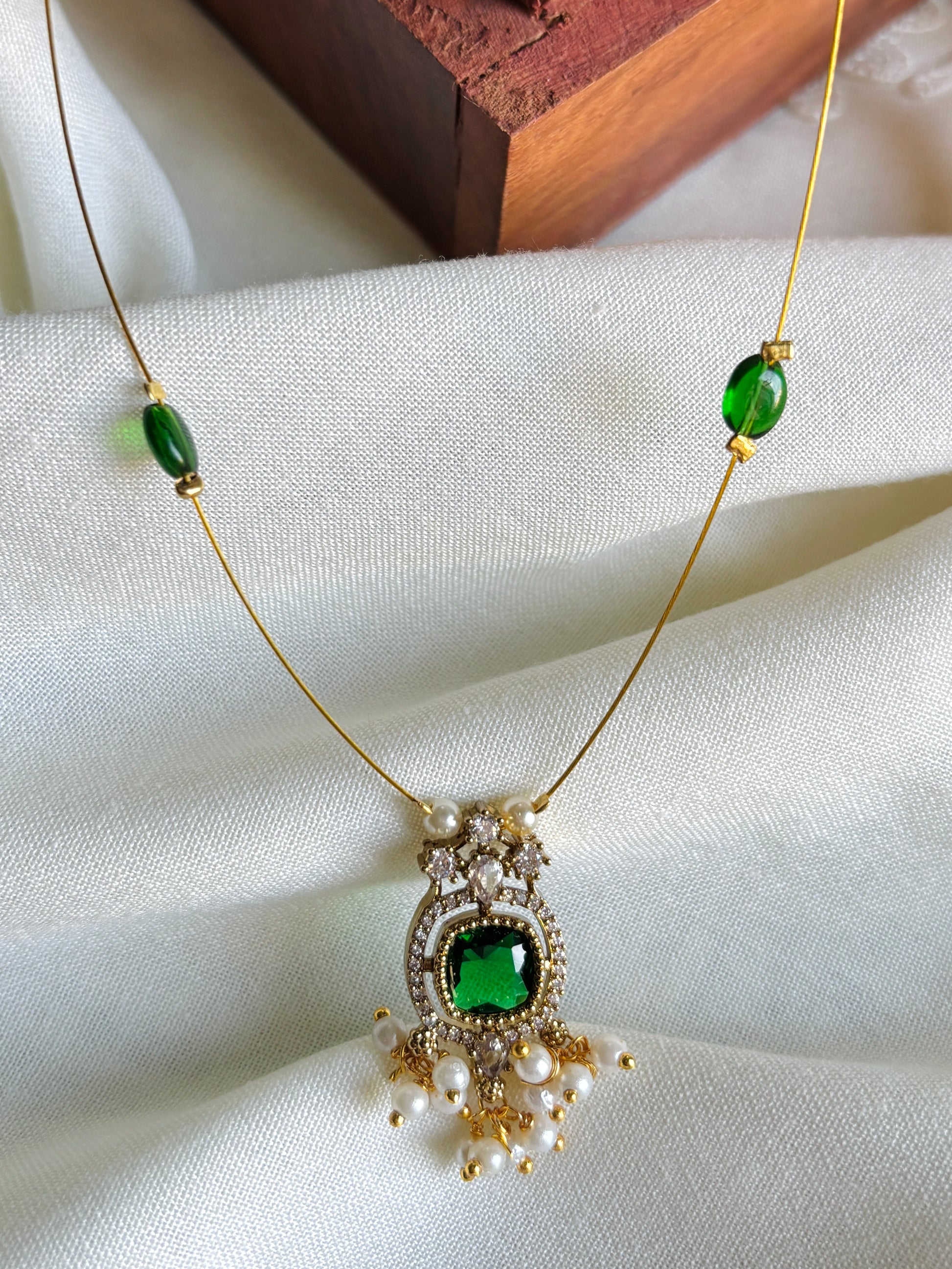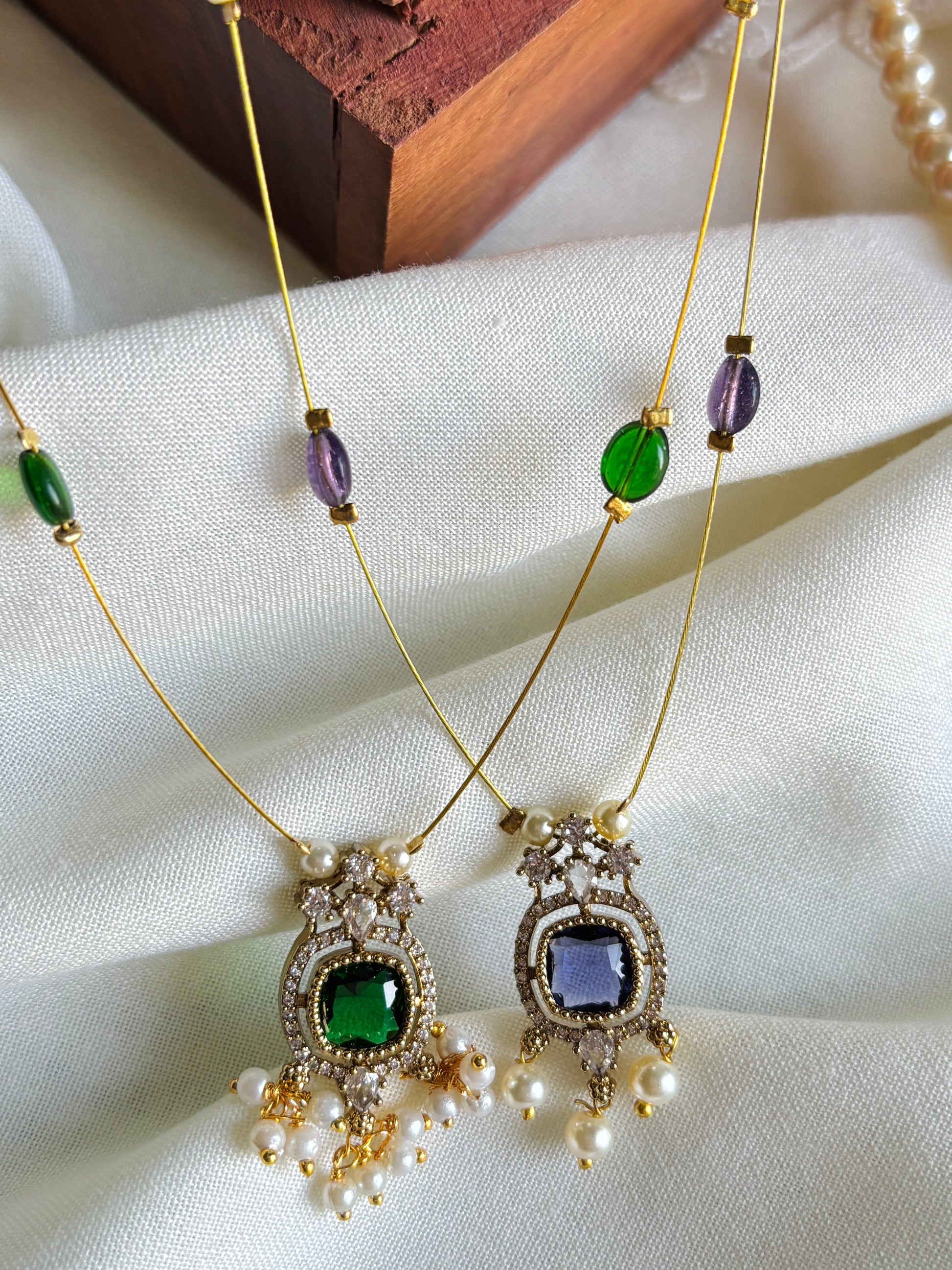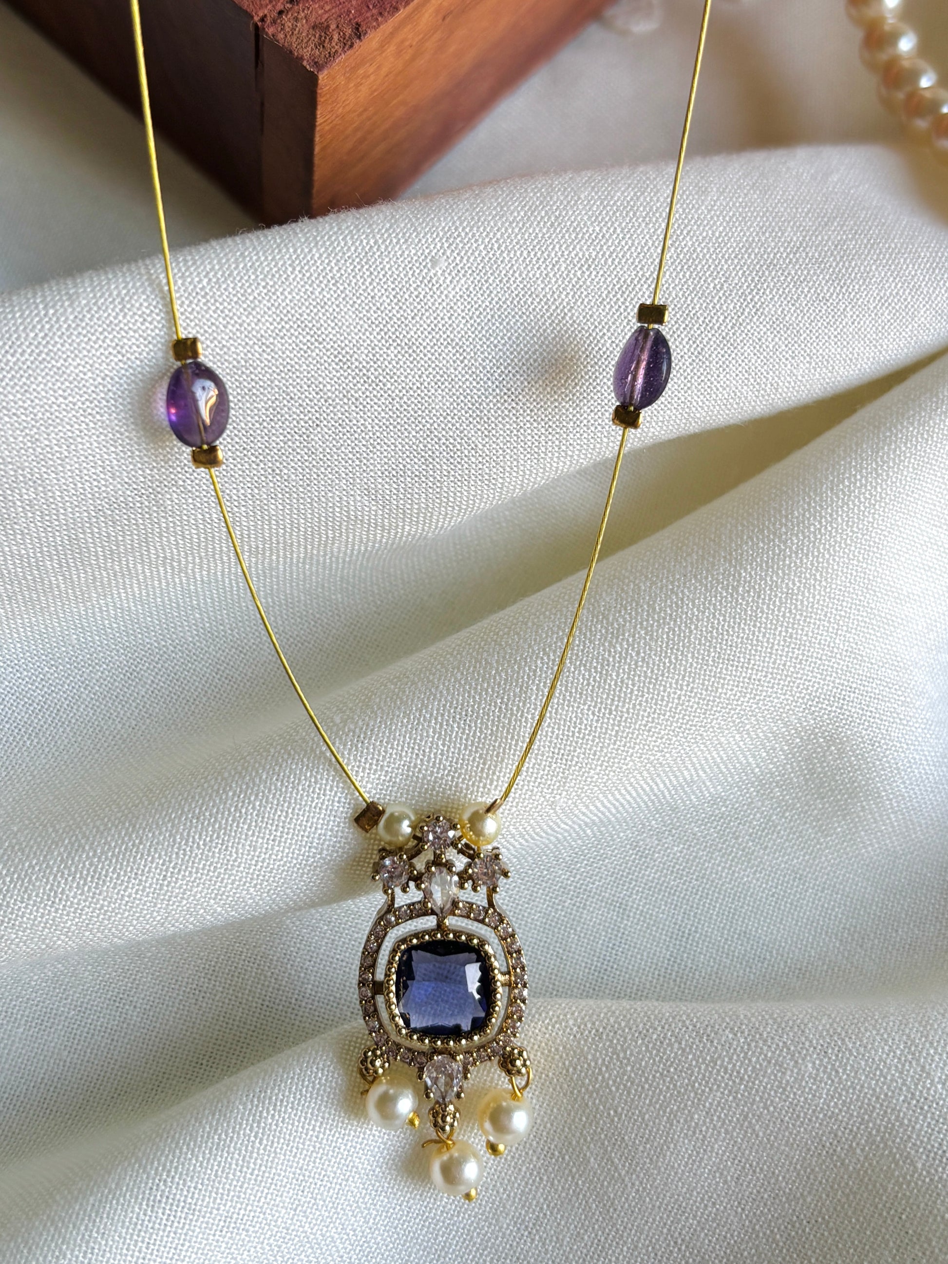 The Samriddhi Necklace by NAQSH is a celebration of prosperity and timeless beauty. Handcrafted with intricate detailing, this piece features a royal violet stone at its heart, framed with sparkling cubic zirconia and finished with graceful pearl drops. The golden chain is accented with subtle beads, adding a touch of elegance to its traditional charm.Perfect for weddings, festive occasions, or gifting, Samriddhi embodies richness, grace, and heritage. ✔ Handcrafted with precision