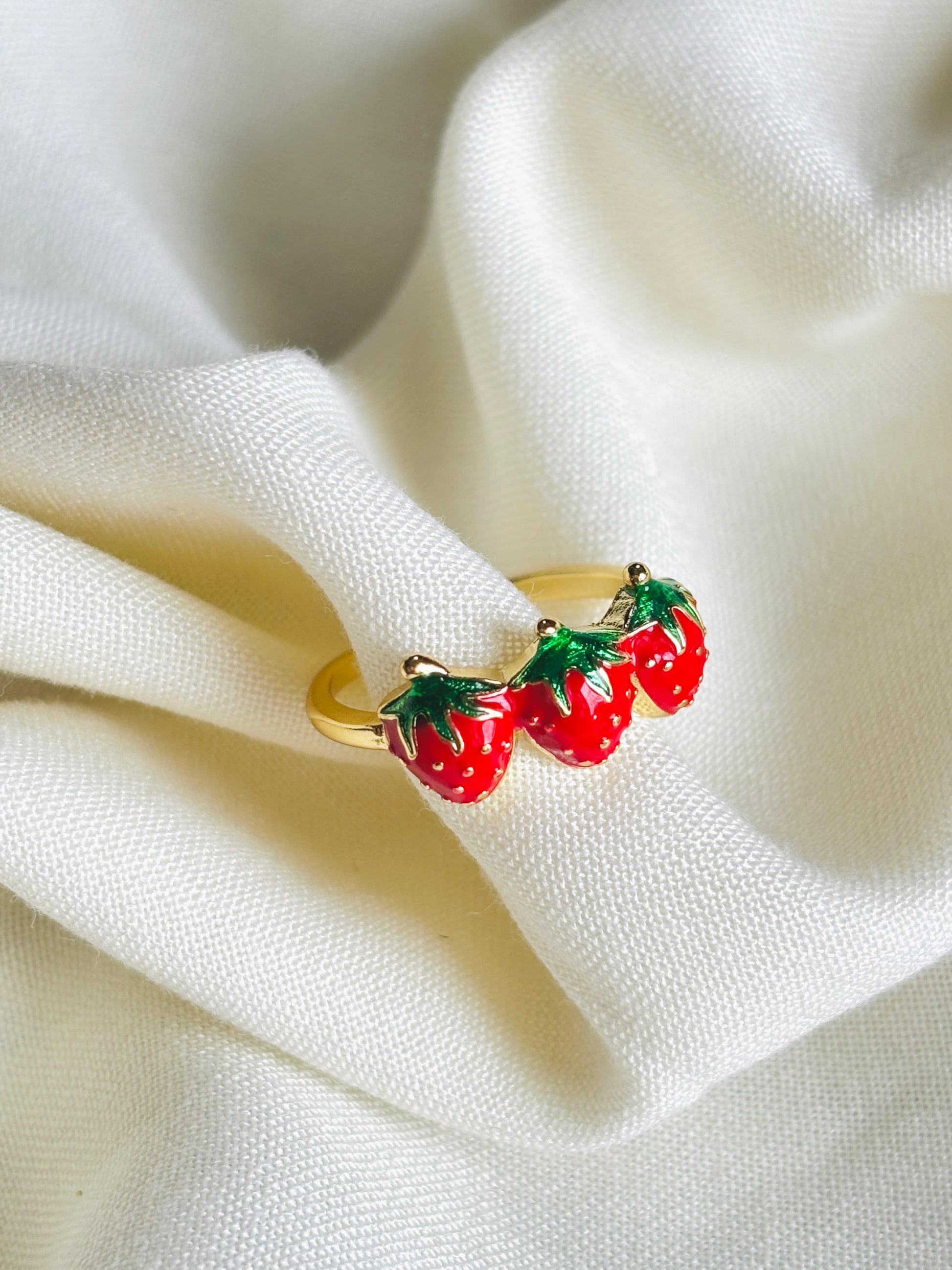 Turn up the sweetness with Tripleberry — a playful ring featuring not one, but three glossy strawberries lined up on a sleek gold-toned band. Bursting with fruity charm and vibrant enamel details, it’s a bold statement piece perfect for those who like their style a little extra and a lot cute.